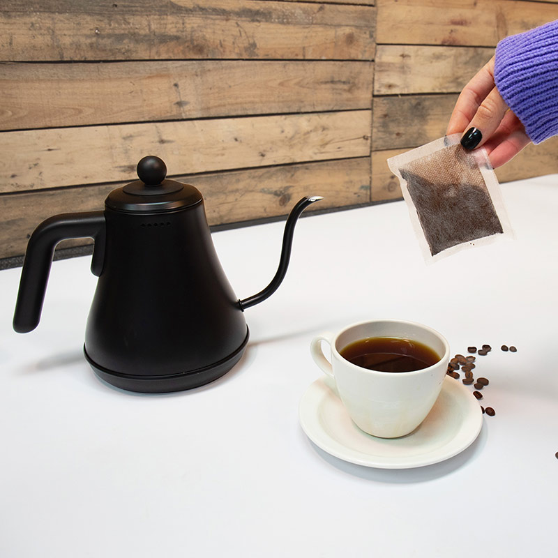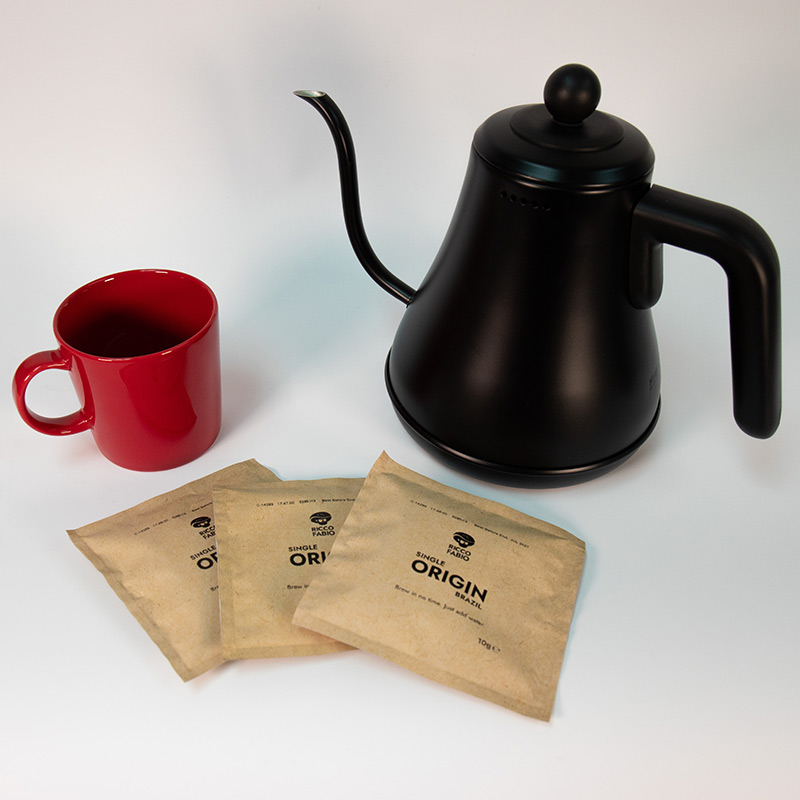 The exceptional taste of Ricco Fabio coffee, without the need for a machine to dispense it. Simply add this coffee bag to a mug, pour hot water over the top, and let it infuse for three minutes before removing. It’s just like a tea bag, but for coffee!